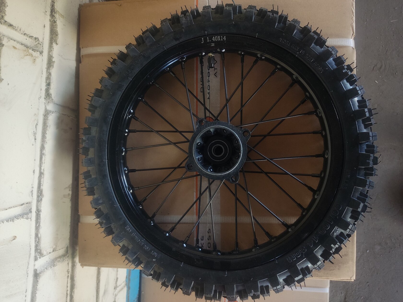 Переднее колесо в полной комплектации с покрышкой. Алюминиевый обод черного цвета диаметром 14 дюймов. Посадочный диаметр под ось 15 мм. Поставляется без тормозного диска и без оси в комплекте.
