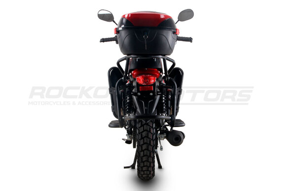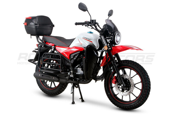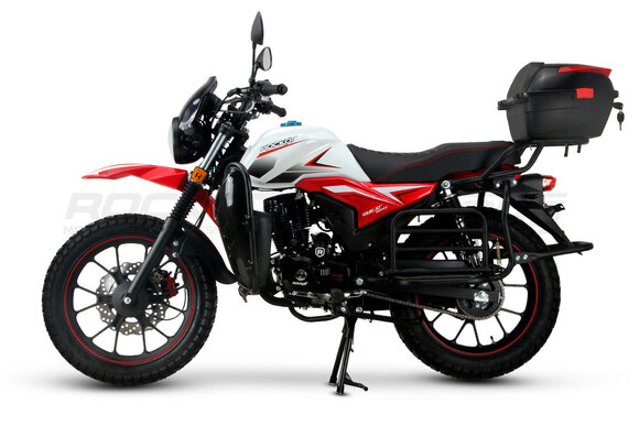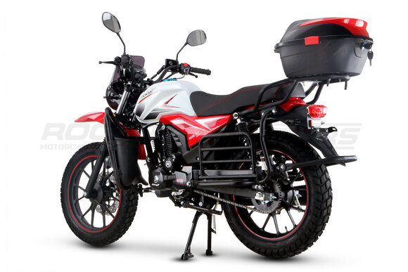 ROCKOT QUEST 150 - новый, дорожный мотоцикл от компании ROCKOT-MOTORS, с большим потенциалом на длительные поездки, независимо от типа дорожного покрытия. Благодаря своим компактным размерам, короткой колесной базе, мотоцикл отлично чувствует себя в городской среде с большим объемом дорожного трафика. Максимальная скорость ROCKOT QUEST 150 - до 92 км/ч на стандартных приводных звездах. Масса мотоцикла -126 килограмм, но при небольшой высоте по седлу в 820 мм и низкому центру тяжести, он ощущается достаточно легким.Мотоцикл имеет ЭПТС, оснащен цветной электронной панелью приборов, зеркалами, всей необходимой светотехникой, что позволяет законно передвигаться по дорогам общего пользования. ДизайнМотоцикл построен в классическом исполнении, но имеет множество современных, технологичных решений.Все световые приборы - светодиодные и очень яркие. Передняя фара имеет круглую классическую форму, но стоит ее включить, как мотоцикл обретает совершенно другой вид.Цветовая гамма модели имеет три варианта окраски: бело-красный, черный и серый.Конечно же, бросается в глаза оснащение мотоцикла туристической багажной системой. На заднем багажнике установлен жесткий центральный кофр. Откидные боковые багажники, позволяют перевозить объемный груз, а также устанавливать боковые багажные сумки. Глядя на мотоцикл, складывается впечатление, что все его пространство использовано максимально практично. Даже в дугах безопасности встроены дополнительные багажные карманы.Топливная системаВ основе топливной системы ROCKOT QUEST 150 - большой топливный бак объемом 12 литров. В зависимости от условий эксплуатации и стиля езды, расход топлива варьируется в районе 3-3,5 литров на 100 километров. Это позволяет преодолевать большие расстояния на одном баке бензина. Используемый тип топлива - бензин АИ-92. Образует топливную смесь - карбюратор PZ27 с ускорительным насосом. Ускорительный насос исключает момент “провала” при резком открытии дроссельной заслонки.Тормозная системаПо канонам классического мотоциклостроения, ROCKOT QUEST 150 имеет комбинированную тормозную систему. Спереди установлен дисковый гидравлический тормоз, с двухпоршневым суппортом, яркого красного цвета. Задний тормоз - механический, барабанный.Кому подойдет ROCKOT QUEST 150Мотоцикл будет очень полезен новичкам. Его небольшие габаритные размеры, низкий центр тяжести, малая высота по седлу - позволяют быстро освоить технику управления мотоциклом как в условиях города, так и бездорожья. С практичной точки зрения, мотоцикл понравится любителям выезжать на отдых за город. Отличная туристическая подготовка, позволит перевозить все, что Вам может потребоваться во время отдыха.Благодаря заложенной надежности в конструкцию двигателя и мотоцикла - ROCKOT QUEST 150 оценит старшее поколение, для кого требуется простая и надежная техника.