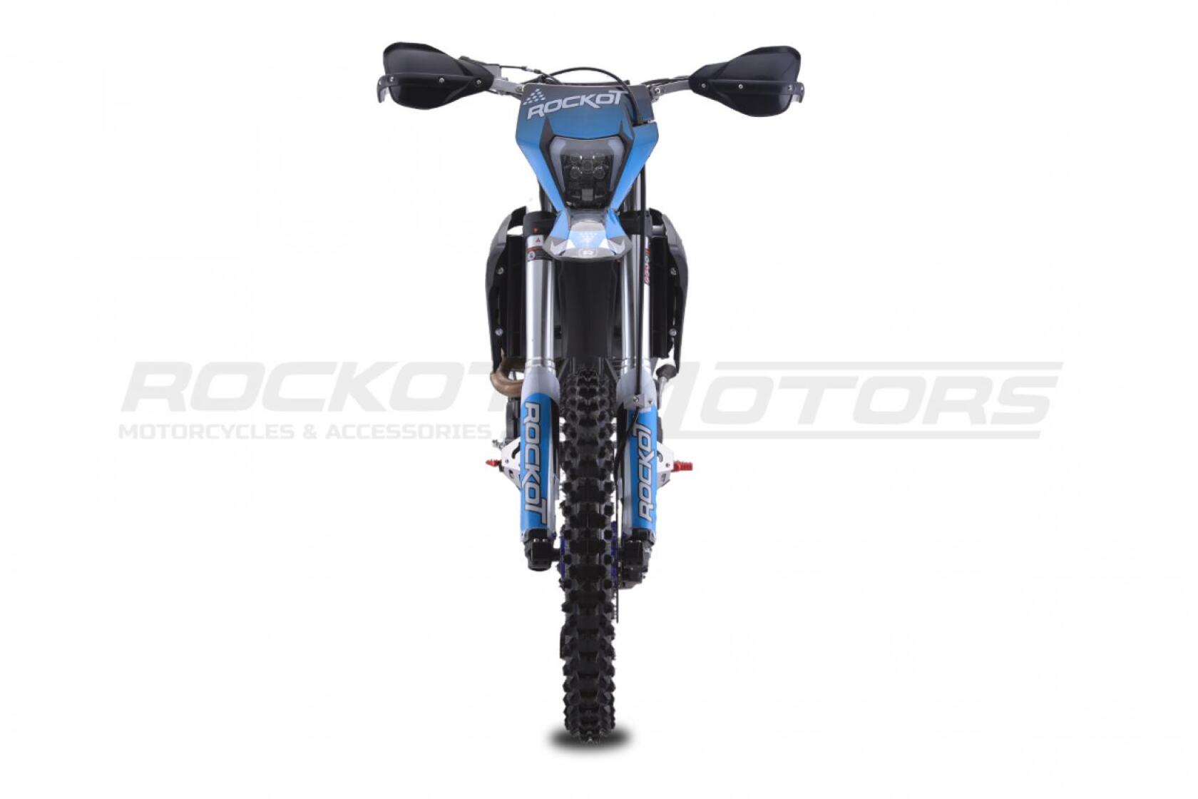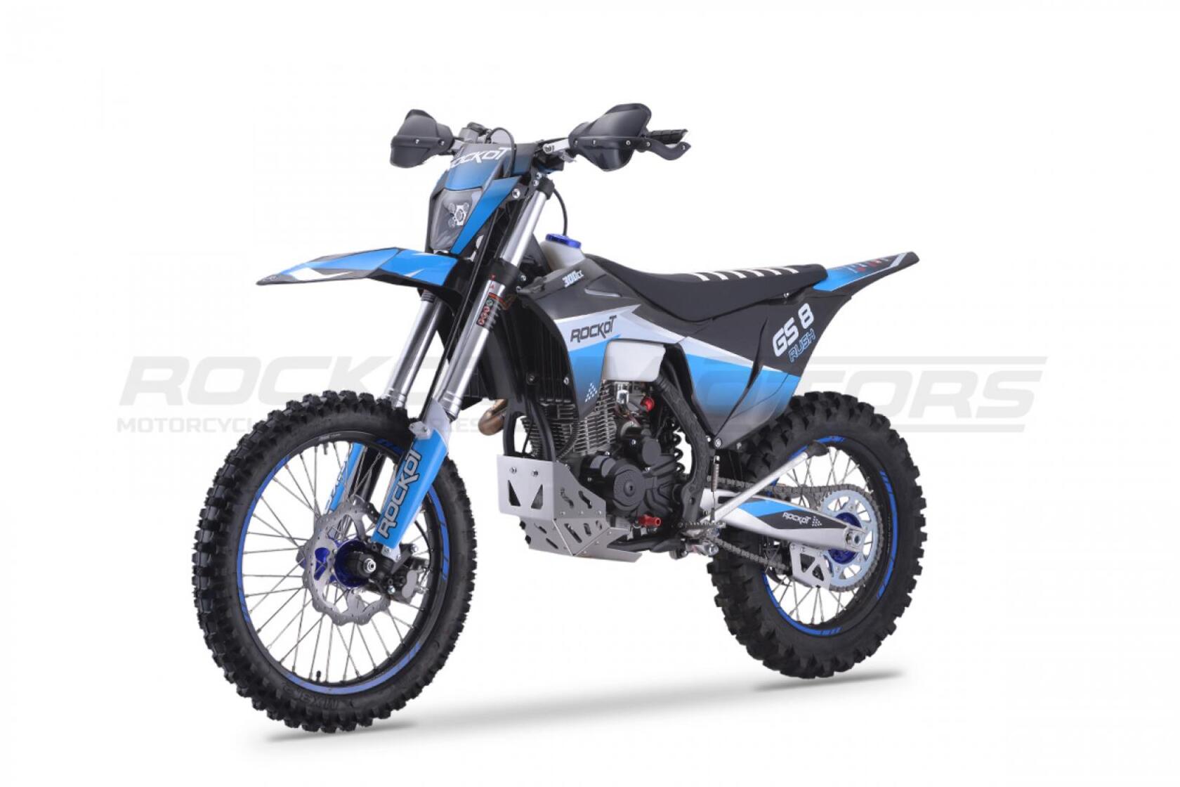 ROCKOT GS 8 RUSH - абсолютная новинка лета 2023 года от компании ROCKOT-MOTORS. Полноразмерный эндуро мотоцикл, с топовой подвеской и совершенно новым мотором, которого ждет не меньший успех, чем “народный” 172-ой.ROCKOT GS 8 RUSH - построен на новой раме S8, в облицовке австрийского GASGAS. Пластик отлит в черном цвете, на который нанесена яркая, контрастная графика в сочетании черного, синего и серого цветов. Расцветка графики эффектно подчеркивает каждую деталь мотоцикла. Рама, траверсы, руль, рычаги тормоза и сцепления, окрашены в черный цвет. В синем цвете выполнены колесные ступицы, CNC крышка бака и защитные наклейки на ободьях колес. Все остальные детали мотоцикла окрашены в серый, металлический цвет.Производительная тормозная система, превосходно останавливает байк на бездорожье даже при резком, экстренном торможении. Превосходный и ощутимый отклик тормозной системы на каждое усилие при нажатии, не позволит Вам допустить ошибку при торможении. Гидролиния переднего и заднего тормоза - армированная. Спереди установлен двухпоршневый тормозной суппорт, сзади - однопоршневый.Задняя тормозная система максимально защищена: задний тормозной цилиндр закрыт пластиковой защитой рамы. Также защищены и задние тормозные суппорт и диск.ROCKOT GS 8 RUSH – полноразмерный эндуро мотоцикл с мощным двигателем воздушно-масляного охлаждения. Данная модель вполне заслуженно является одной из лучших, среди эндуро мотоциклов предназначенных для гонок класса «Lite» и способна привезти новичка на «тумбу победителей»
