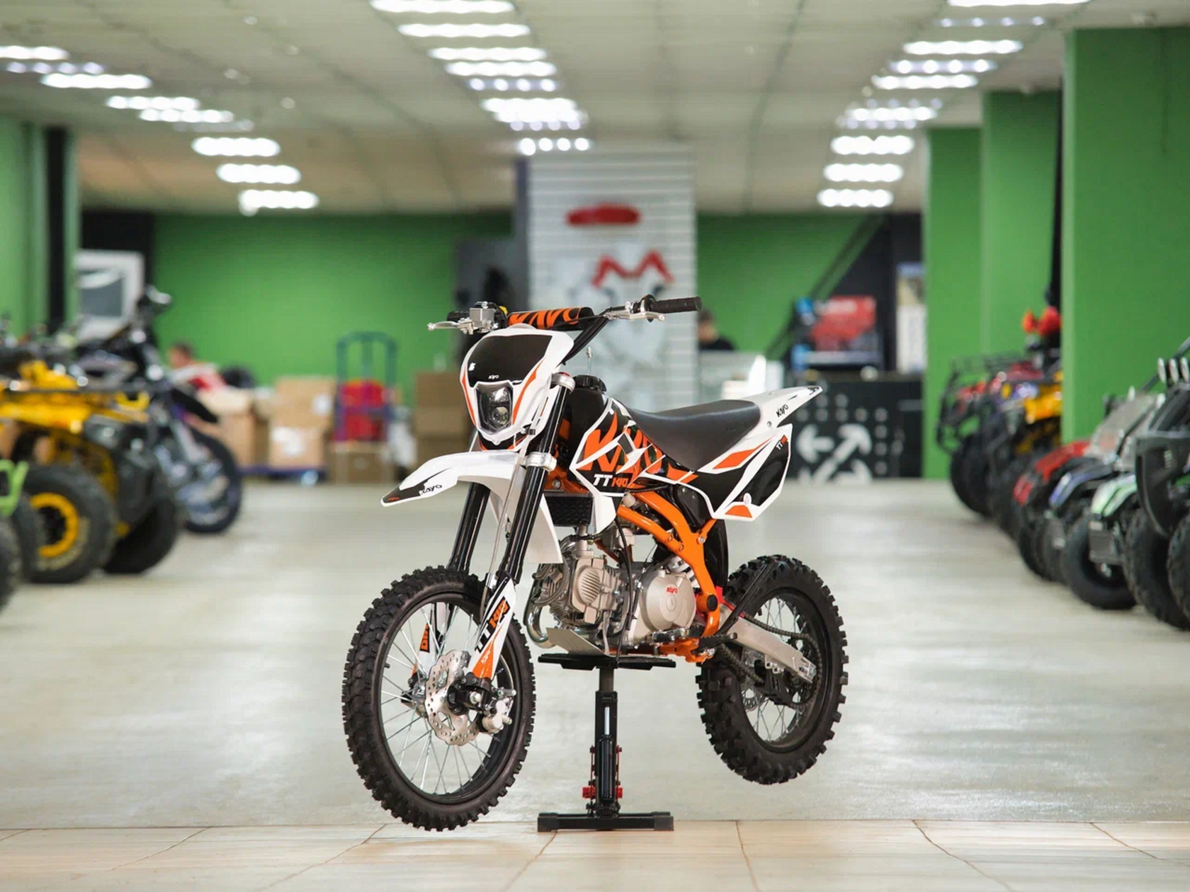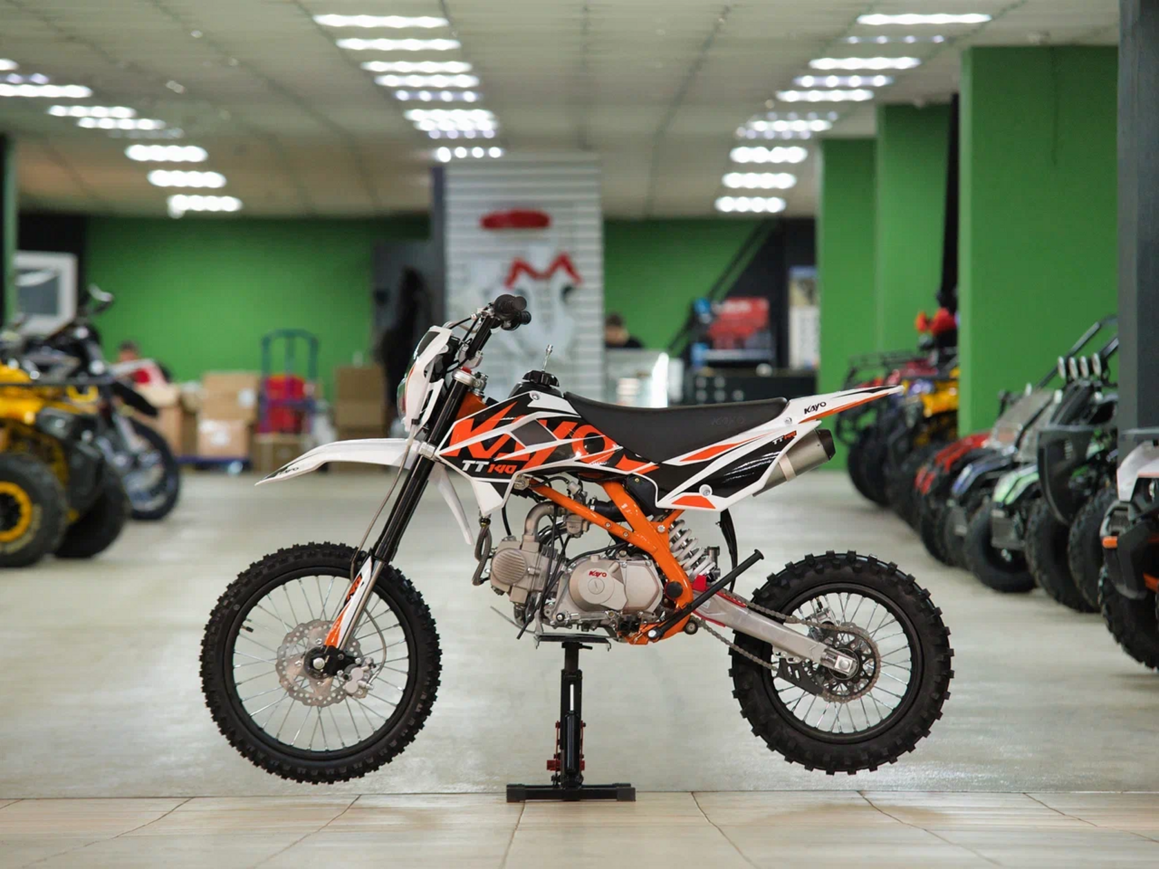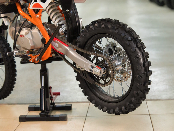 Питбайк KAYO Basic TT140EM KRZ – простой в обслуживании и выносливый байк для тренировок. Рекомендован подросткам, которые готовятся к соревнованиям, но подойдёт и для повседневных прокатов.Одноцилиндровый 4-тактный двигатель воздушно-масляного охлаждения YX1P56FMJ объёмом 140 см3, выдаёт 11 л.с. Карбюратор NIBBI PE19 обеспечивает бесперебойную работу техники в самых жёстких условиях эксплуатации, простоту и лёгкость в обслуживании, а также неприхотливость к качеству топлива. Питбайк имеет вместительный топливный бак на 5,5 л. Питбайк оснащён механической 4-ступенчатой коробкой передач с формулой “N-1-2-3-4”. Запуск двигателя осуществляется с помощью рычага кикстартера.Мотоцикл имеет вес всего 72 кг. Усиленная рама из хром-молибденового сплава и подвеска позволяют эффективно амортизировать удары при езде по неровностям и препятствиям на трассе. Передняя подвеска — телескопическая вилка перевёрнутого типа длиной 770 мм, задняя — моноамортизатор длиной 360 мм. Оба компонента подвески являются нерегулируемыми. Рама и пластик являются собственной разработкой производителя. Мотоцикл оснащён классическими стальными спицованными колёсами диаметром 17 дюймов спереди и 14 дюймов сзади. Эффективное и безопасное замедление с любых скоростей обеспечивают гидравлические дисковые тормоза. Высококачественная износостойкая резина с развитым протектором отлично держит дорогу на различных типах покрытия.Питбайк оснащён яркой светодиодной линзованной фарой, позволяющей кататься в тёмное время суток.Если вы ищете послушный, компактный, динамичный и красивый питбайк, считайте, что вы его нашли. Это один из лучших мотоциклов для обучения и первых шагов в эндуро и мотокроссе. Он отлично подойдёт как для гонок на трассе, так и для обычного катания по пересечённой местности.