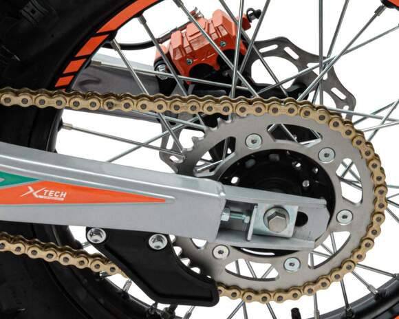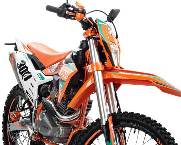 Мотоцикл Кросс SMX300 с ПТС это отличный кроссовый мотоцикл. Имеет хорошую проходимость и тяговую мощность за счет установленного двигателя ZONGSHEN 175FMM мощностью 25 л.с. и карбюратора NIBBi 32. Идеален для бездорожья, т.к. его кроссовые шины (120-90) и (80-100) просто созданы для езды по мягкому и среднему грунту. Телескопическая вилка с регулировками перевернутого типа позволяет легко преодолевать ямы, ухабы и другие неровности. Задняя подвеска маятниковая, с моноамортизатором. Его дизайн подчёркивает неуступчивый спортивный характер байка.Мотоцикл Кросс SMX300, выдерживает нагрузку до 150 кг. Прочный облицовочный пластик типа КТМ 2024 года. Надёжно закрепленный руль имеет переменное сечение: 28 мм в месте крепления и 22 мм на концах под грипсами, а также короткоходную ручку газа. На мотоцикле установлена защита рук и подножки для пассажира. Колёса алюминиевые, оснащены усиленными спицами и антибуксаторами, размер переднего — 21 дюйм (80-100), заднего — 18 дюймов (120-90), тормозная система – с одно и двухпоршневыми тормозными суппортами соответственно.Для запуска двигателя можно использовать электростартер или кикстартер. Система зажигания электронная (CDI). Механическая трансмиссия содержит 5 передач. У мотокросса отличный запас хода: - 9 л, расход топлива - 5 л на 100 км. Передняя LED фара обновленного дизайна легко включается поворотом замка зажигания и позволяет ездить в сумерках и темноте, а также стоит эргономичная и многофункциональная приборная панель.